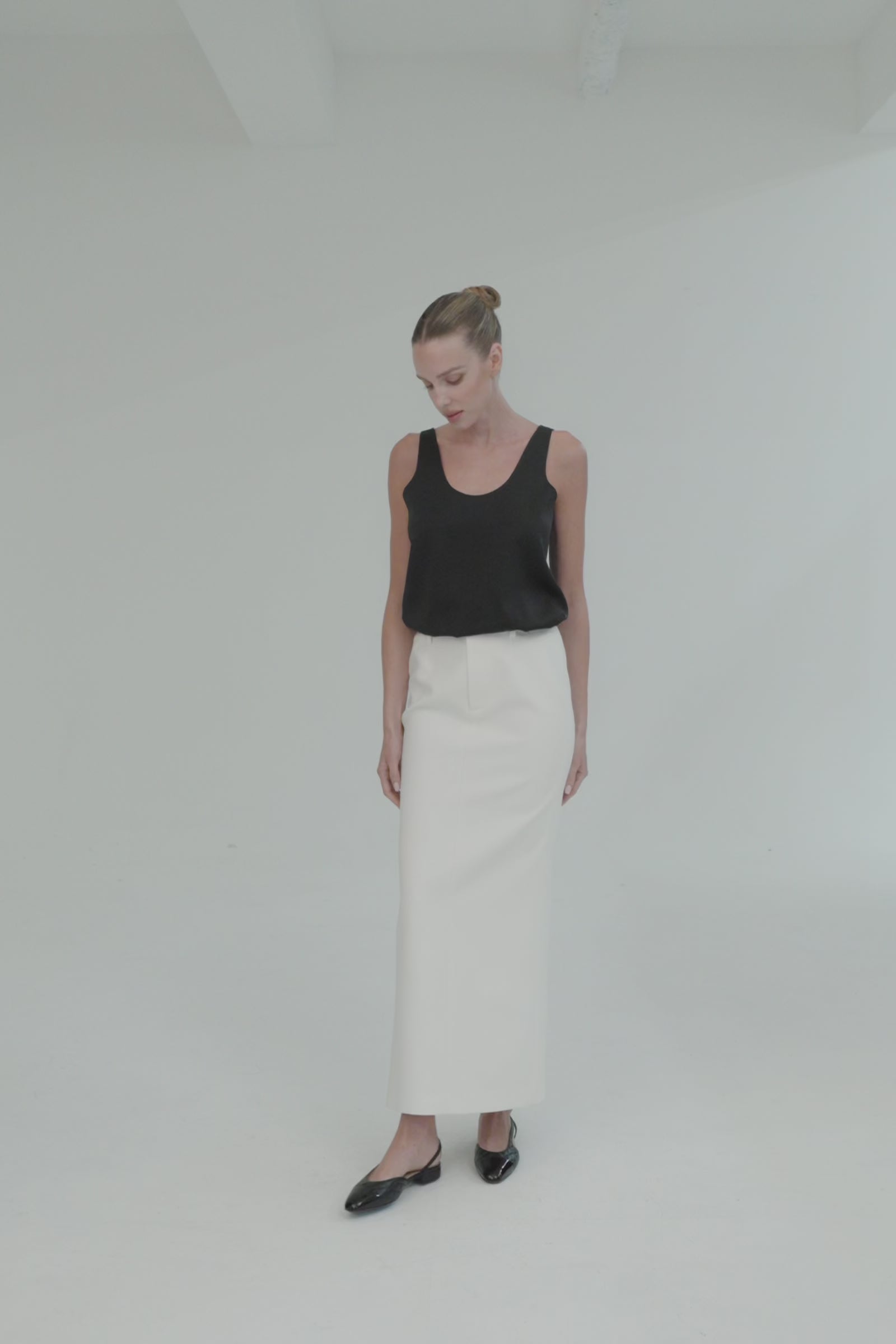 A tailored long skirt designed with a clean silhouette and a subtle back slit for ease of movement.
