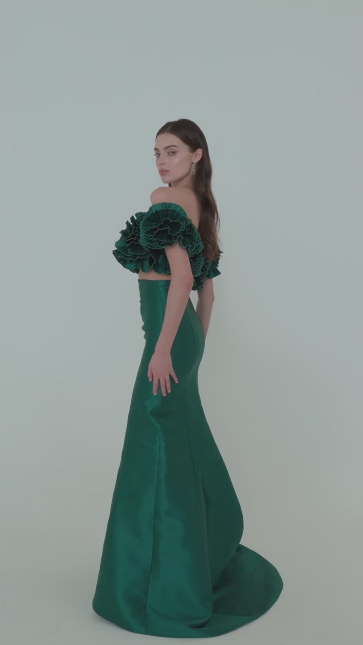 Layered ruffles bloom along the off-shoulder bodice, forming a romantic floral line. A high-waisted skirt flows into a soft mermaid shape. A versatile option for receptions and cocktail hours.