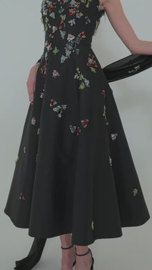 Mikado midi dress highlighted with intricate beaded flower detail, creating a refined balance of structure and feminine charm. Complete the ensemble with a chiffon scarf adorned with matching embellishments.