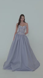 A sleek strapless gown elevated with intricate floral embellishments that glimmer under the light. A refined option for a gala or black-tie events.